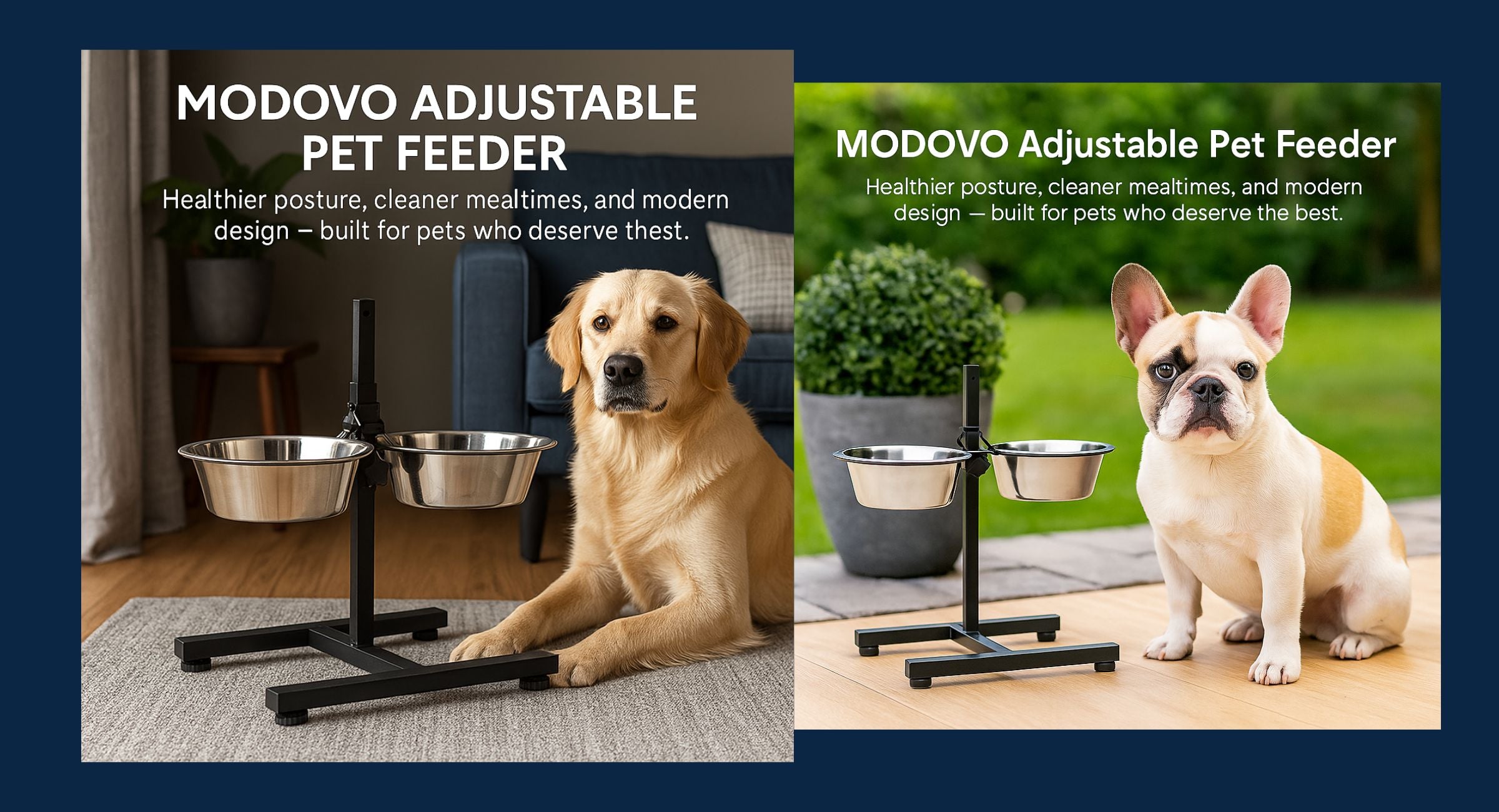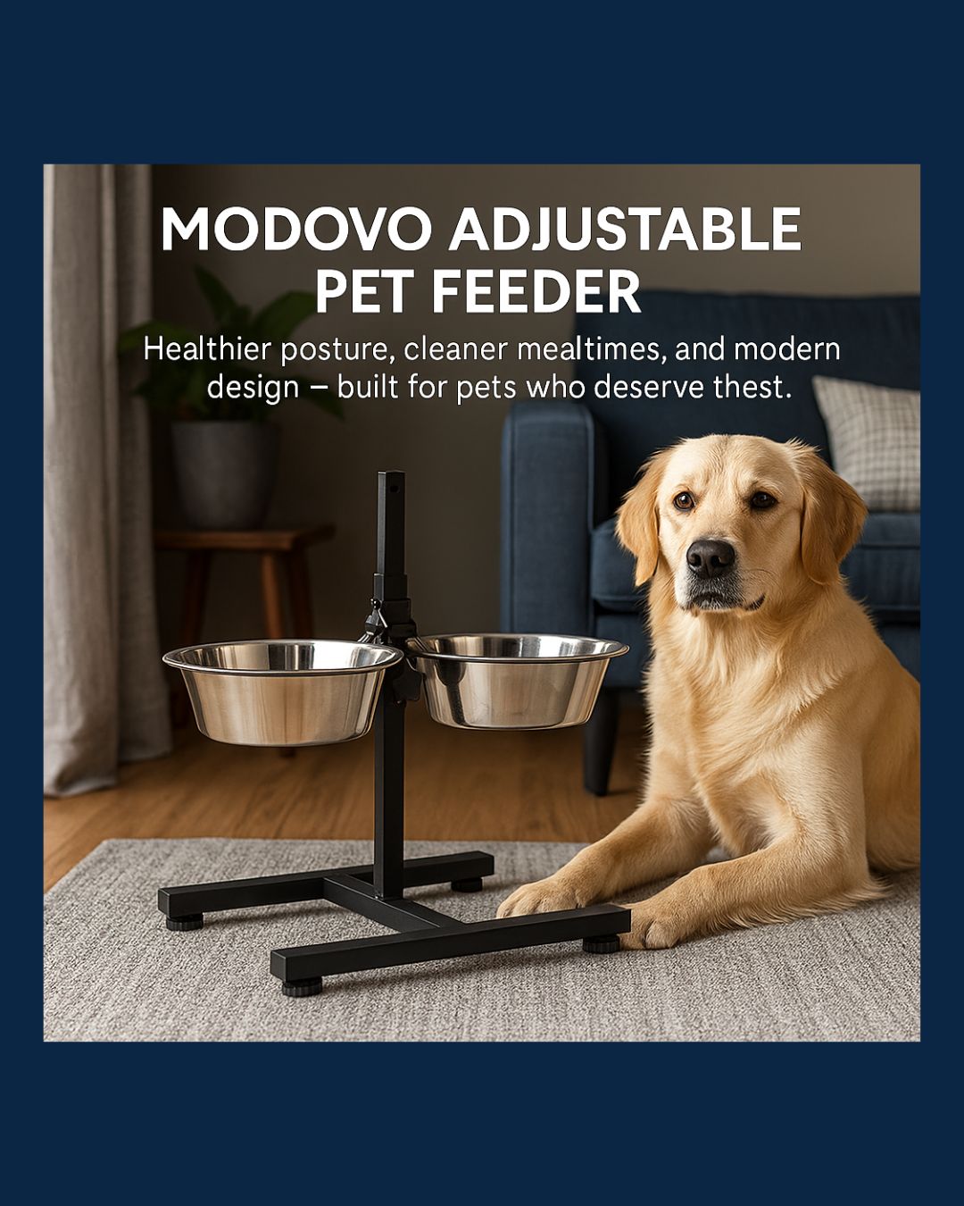 Elevate your pet’s mealtime comfort with the MODOVO Adjustable Double Bowl Feeder — designed for healthier posture, cleaner feeding, and long-lasting durability.