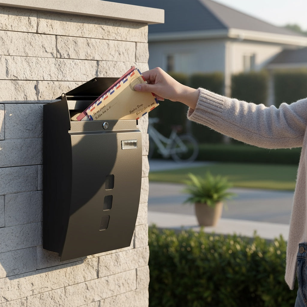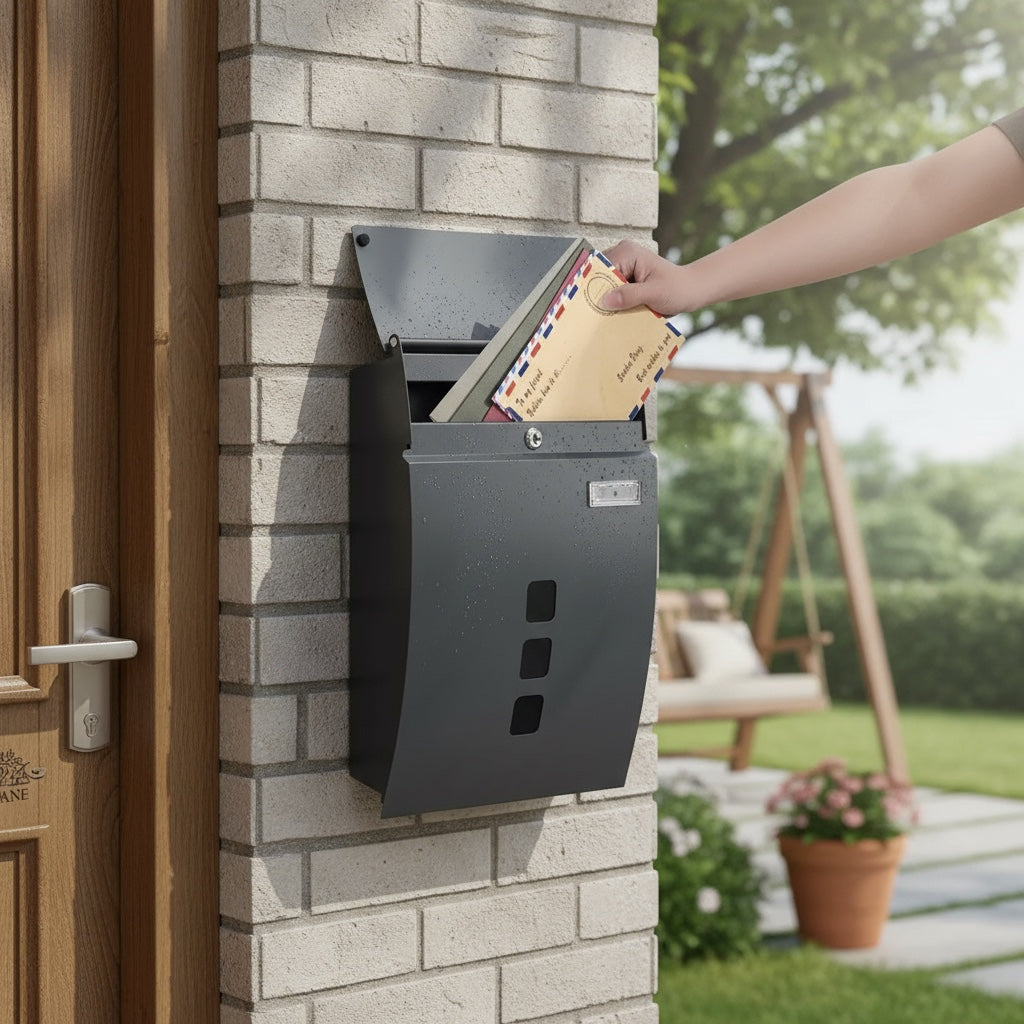 Our signature wall-mounted post box — where sleek curves meet timeless elegance. Designed in black and grey for a modern, minimalist home exterior.